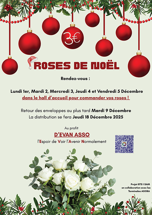 Présentation du projet solidaire de vente de roses blanches organisé par les BTS 1re année SAM et les Tles AGORA, par Ayrton, Inès et Tim (BTS 1SAM). Vente du 1er au 5 décembre.